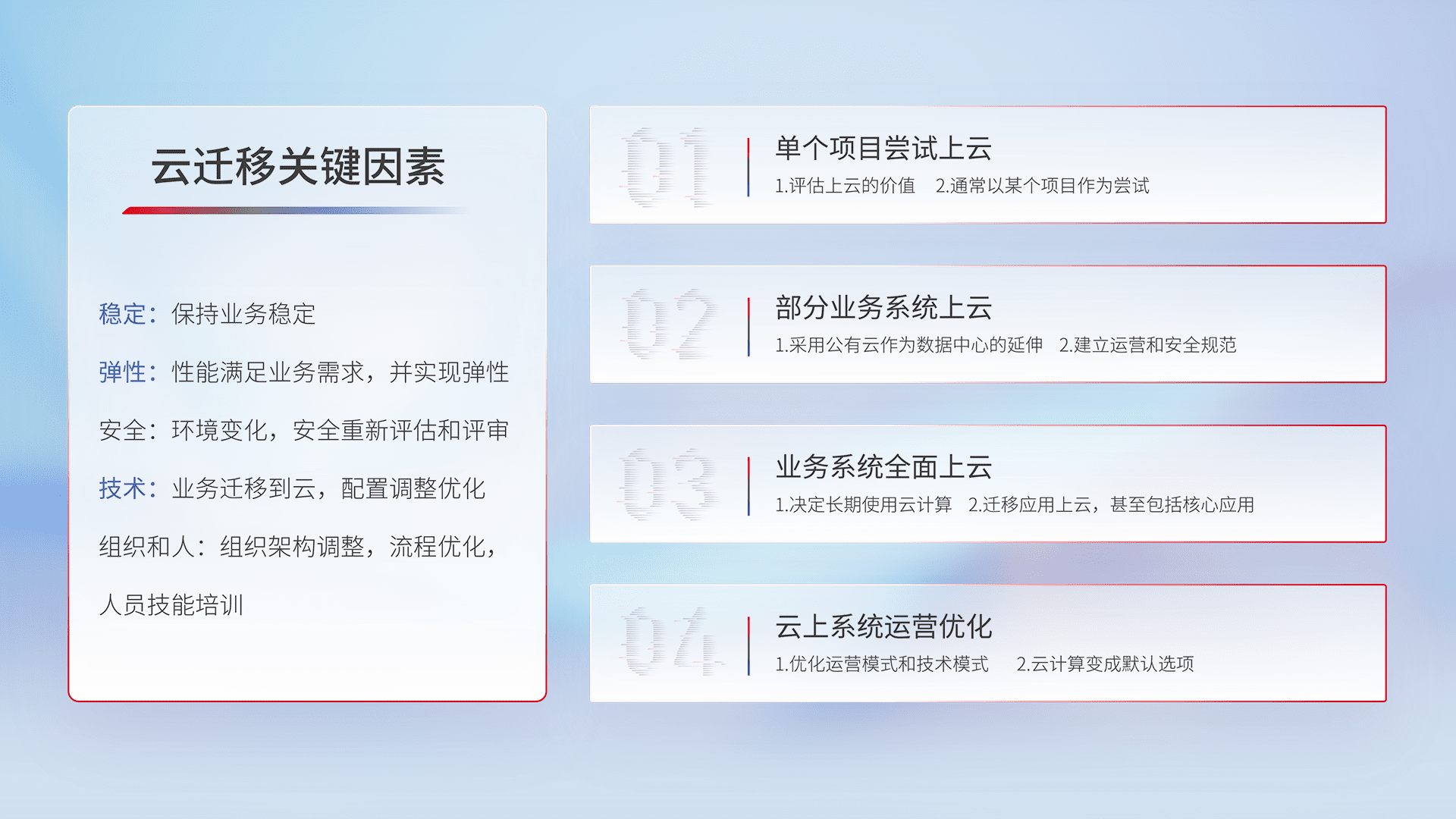 结合实际业务,,,从规划设计、、、云平台选型、、云原生改造、、数据迁移、、集成交付,,,迁移全过程为客户识别最佳上云路径,,,,做好风险识别管理,,,,设计网络架构、、、、身份权限、、、安全审计合规、、、操作审计、、、日志审计、、、监控告警策略、、、多站点容灾设计等,,对云上基础设施进行整体规划,,,,提升IT治理水平,,,以满足弹性、、高可用、、高性能的需求。。。。